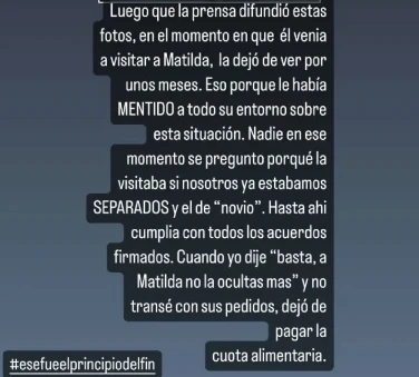 "Luego de que la prensa difundió estas fotos de cuando él venía a visitar a Matilda, la dejó de ver por unos meses. Él le había MENTIDO a todo su entorno sobre esta situación. Nadie en ese momento, se preguntó por qué la visitaba si nosotros ya estábamos SEPARADOS y él, de 'novio'. Hasta ahí, cumplía con todos los acuerdos firmados", reza el texto publicado por la ex vedette.
