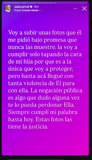 “Voy a subir fotos que él me pidió bajo promesa que nunca las muestre. Hasta acá llegué con tanta violencia de él para con ella. La negación pública es algo que dudo que mi hija llegue a perdonar alguna vez. Siempre cumplí mi palabra hasta hoy. Estas fotos las tiene la justicia”, aseguró.
