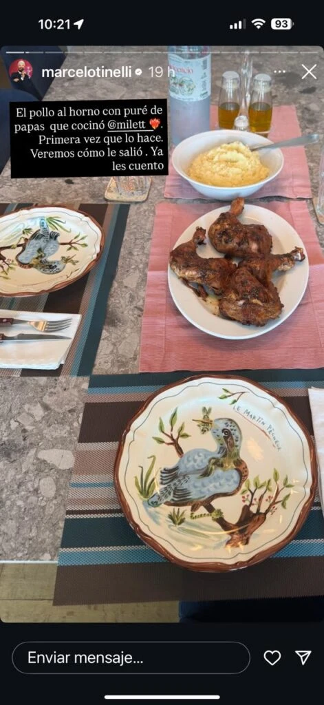“El pollo al horno con puré de papas que cocinó Milett. Primera vez que lo hace. Veremos cómo salió. Ya les cuento”, escribió Marcelo entre sus historias y sobre una imagen de un plano general de la mesa puesta con individuales y platos con ilustraciones pintadas.