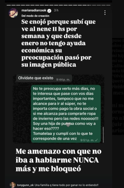Mariana narró la amedrentamiento que ejecutó El Dipy contra su humanidad y la paz de su niño: “Me amenazó con que no me iba a hablar nunca más y me bloqueó”. Por eso, la mediática añadió: “Ahora la culpa la tengo yo, esto será la excusa para no aparecer más o sentarse en un canal de televisión a llorar mientras yo laburo todo el día, todos los días, para llegar a fin de mes”.
