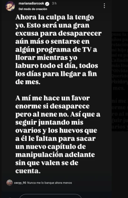 Agotada por toda esta situación, Mariana reconoció: “A mi me hace un favor enorme si desaparece, al nene no”. Y explicó su postura para evitar que su hijo sufra: “Así que a seguir juntando mis ovarios y los huevos que le faltan a él para sacar adelante un nuevo capítulo de manipulación sin que Valen se de cuenta”.