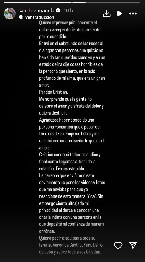 "Siento ultrajada mi privacidad al darse a conocer una charla íntima con una persona en la que deposité mi confianza de manera errónea. Quiero pedir disculpas a toda su familia, Verónica Castro, Yuri, Darío de León y sobre todo a vos, Cristian”, concluyó Sánchez.