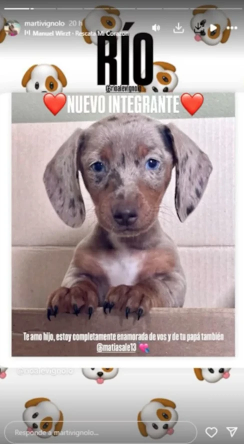 El dato en particular es que la perrita ya tiene su propia cuenta de Instagram, con el nombre de Río Alé Vignolo, utilizando los dos apellidos de la pareja. “Llegué a mi familia para el aniversario de mis papis, ya los amo mucho”, se puede leer en el primer posteo de dicha cuenta creada para el cachorrito.