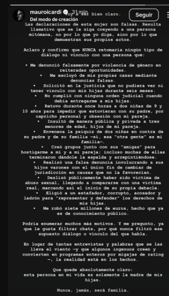 Y luego armó una lista interminable de situaciones que protagonizó Wanda. "Me denunció falsamente por violencia de género en reiteradas oportunidades. Me excluyó de mis propias casas mediante denuncias falsas. Solicitó en la justicia que no pudiera ver ni tener vínculo con mis hijas durante seis meses", asestó.