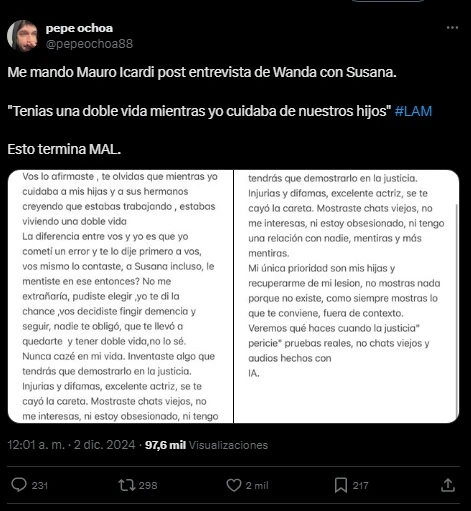 En este contexto, Icardi no tardó en salir al cruce luego de escuchar las palabras de su ex y disparó una ferviente acusación contra ella. Las palabras del delantero fueron compartidas por Pepe Ochoa, panelista de LAM, a través de su cuenta de X. “Me mandó Mauro Icardi post entrevista de Wanda con Susana”, comenzó explicando, para luego compartir las capturas de las palabras del rosarino.