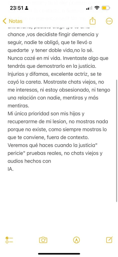 Y siguió: “La diferencia entre vos y yo es que yo cometí un error y te lo dije primero a vos. Vos mismo lo contaste. ¿A Susana incluso, le mentiste en ese entonces? No me extrañaría. Pudiste elegir, yo te di la chance, vos decidiste fingir demencia y seguir. Nadie te obligó. Qué te llevó a quedarte y tener doble vida, no lo sé”.