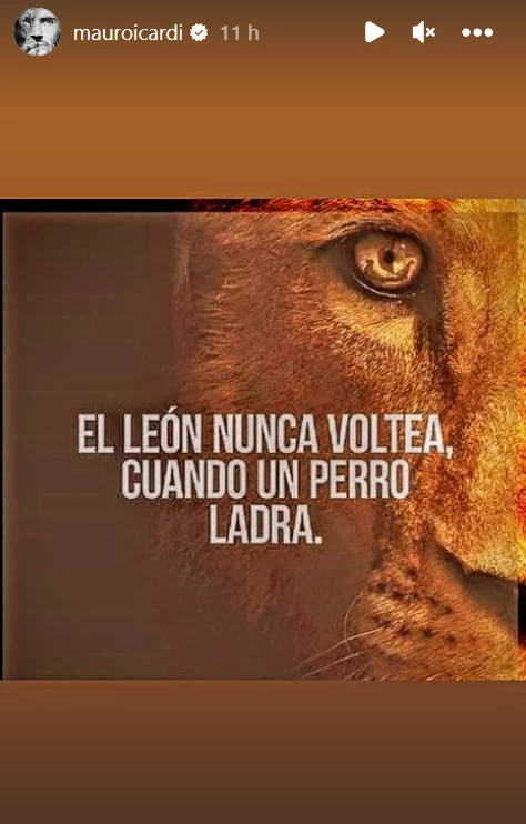 “Un león nunca voltea cuando un perro ladra”, expresó Mau en sus historias de Instagram, aún bajo riesgo de quedar como un “gatito mimoso”. Claramente, la postura de Icardi es mantenerse altivo en esta guerra de chicanas que suele mantener con Elián Valenzuela.
