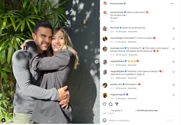 "Felices 6 años amor, por muchos más. Te amo", posteó Vicciconte, junto a dos imágenes donde se los ve súper pegaditos y sonrientes con Fabián. Los enamorados hoy son familia también junto a Indiana, hija del ex deportista, quien vive con ellos tras el distanciamiento de su madre, Nicole Neumann.