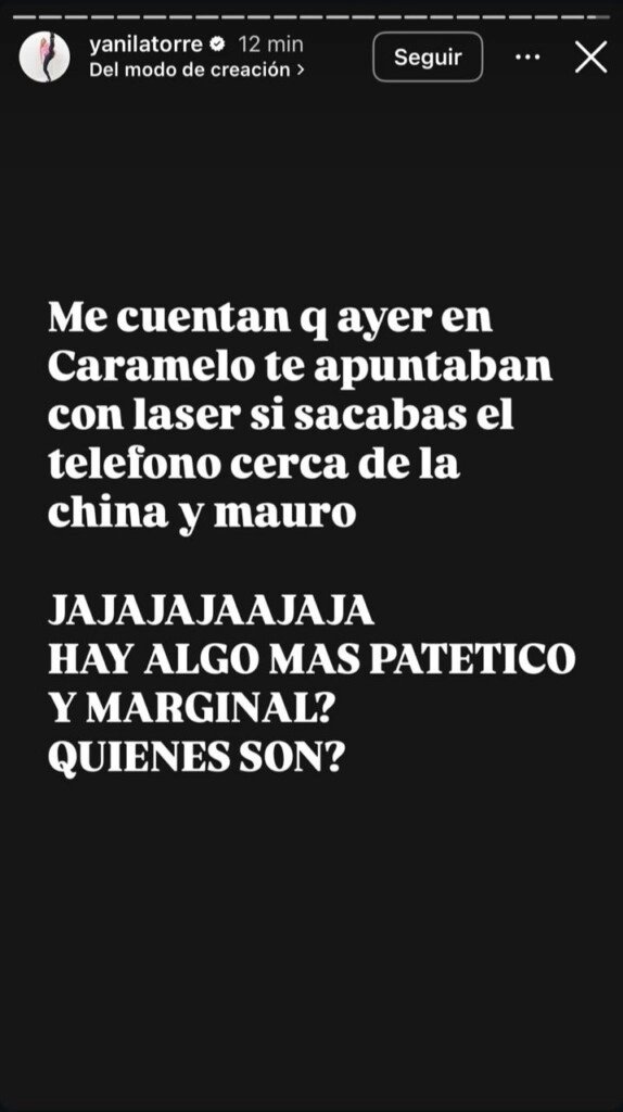 “Me cuentan que ayer en Caramelo te apuntaban con láser si sacabas el teléfono cerca de la China y Mauro”, escribió, dejando entrever un nivel de control extremo durante la salida nocturna. Y cerró con una frase que no pasó desapercibida: “¿Hay algo más patético y marginal? ¿Quiénes son?”.