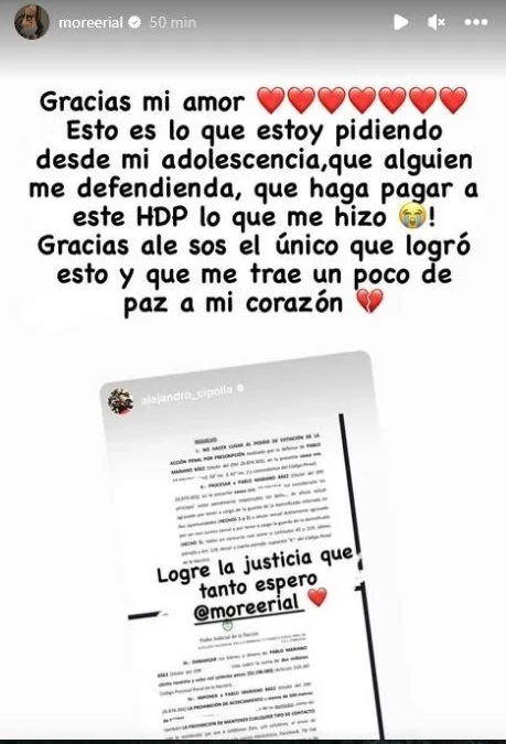 "Gracias Ale. Sos el único que logró esto y que trae un poco de paz a mi corazón", compartió More Rial junto a la imagen de un corazón partido. En tanto, el letrado también se expresó a través de las redes sociales. "Logré la justicia que tanto esperó", expresó Alejandro.
