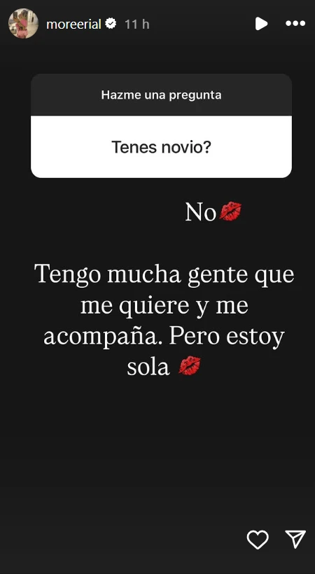 Así las cosas, Morena todavía no lo presenta como su novio oficial. Así lo dejó ver al responder una pregunta de sus seguidores, que quería saber si estaba en pareja. “No, tengo mucha gente que me quiere y me acompaña pero estoy sola”, dijo ella, contundente.