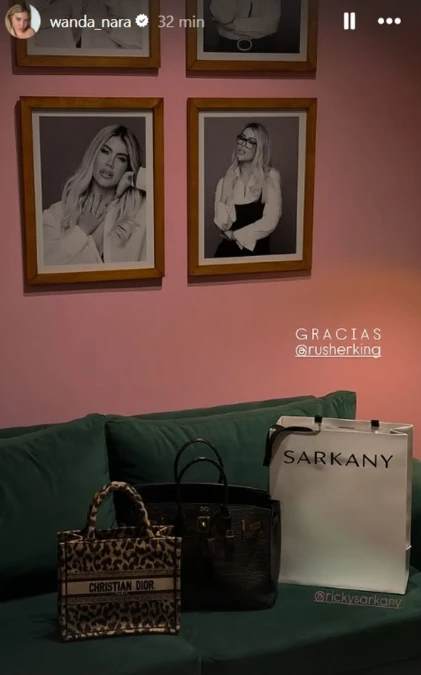 En ese contexto, Wanda recurrió a sus redes para mostrar un gesto que rápidamente encendió los rumores de un posible romance. A través de sus historias de Instagram, compartió una imagen de una bolsa de la marca Sarkany apoyada sobre un sofá verde, acompañada por dos carteras de lujo: una de Christian Dior y otra de diseño cocodrilo.