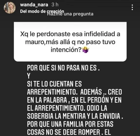La mánager del delantero del PSG aprovechó la ocasión para apuntar, sin filtro, contra la María Eugenia, a quien trató de “gente mal intencionada”. “¿Por qué le perdonaste esa infidelidad a Mauro, más haya que de no pasó, tuvo la intención?”, fue consultada Wanda, a través de su cuenta de IG.