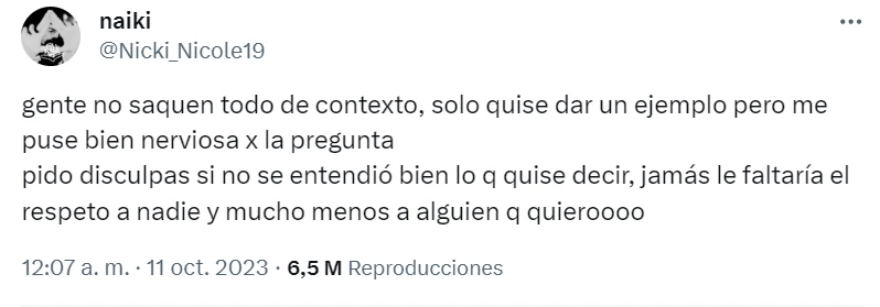 “Gente, no saquen todo de contexto, solo quise dar un ejemplo pero me puse bien nerviosa por la pregunta. Pido disculpas si no se entendió bien lo que quise decir, jamás le faltaría el respeto a nadie y mucho menos a alguien que quiero”, se expresó Nicole en Twitter.