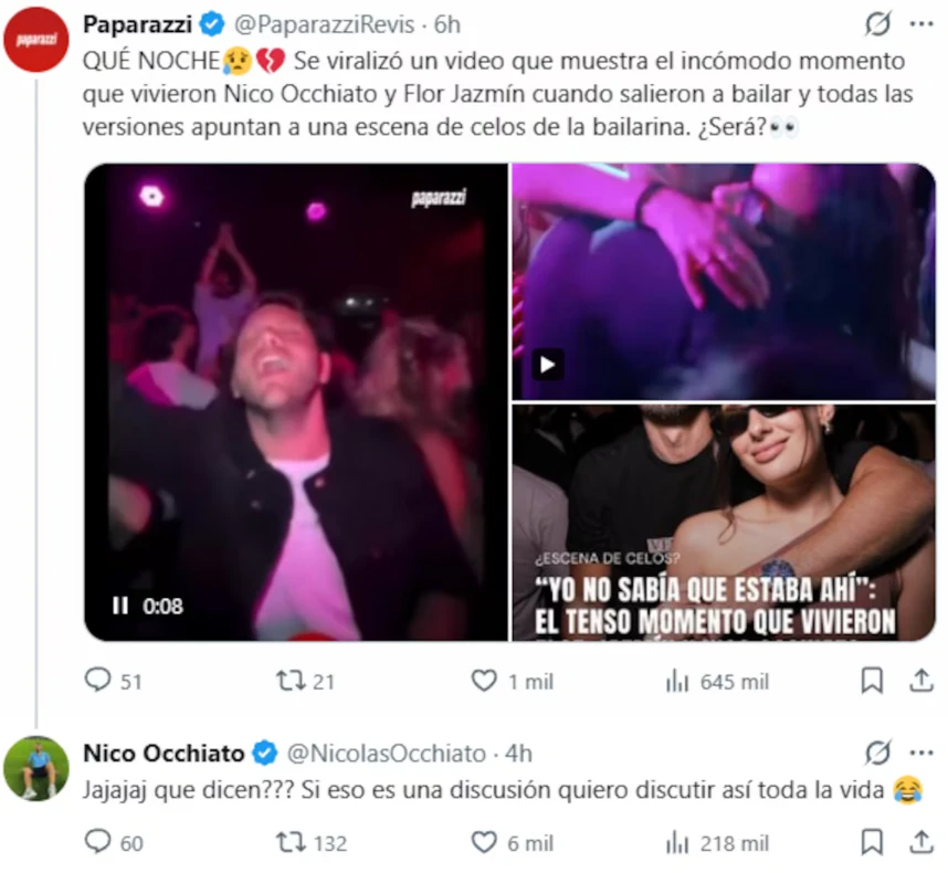 “Se viralizó un video que muestra el incómodo momento que vivieron Nico Occhiato y Flor Jazmín cuando salieron a bailar y todas las versiones apuntan a una escena de celos de la bailarina. ¿Será?”, se leía en el tuit que sumaba varias fotos y material sujeto a diversas interpretaciones.