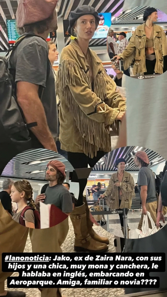 Fue Marcia Frisciotti —conocida en redes como Pochi de Gossipeame— quien dio el primer indicio a través de sus historias de Instagram. “Jakob, ex de Zaira Nara, con sus hijos y una chica, muy mona y canchera, le hablaba en inglés, embarcando en Aeroparque”, escribió. Y lanzó la pregunta que encendió el misterio: “¿Amiga, familiar o novia?”.
