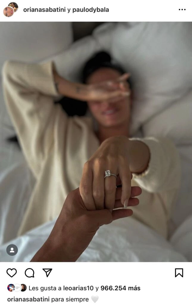 Mediante un posteo en su muro de instagram, el cual luego replicó entre sus historias tanto ella como su futuro marido, Oriana posó cubriéndose el rostro con uno de sus brazos mientras que el otro estaba extendido y Dybala sosteniendole la mano dejaba entrever la jota con brillo en su dedo anular.