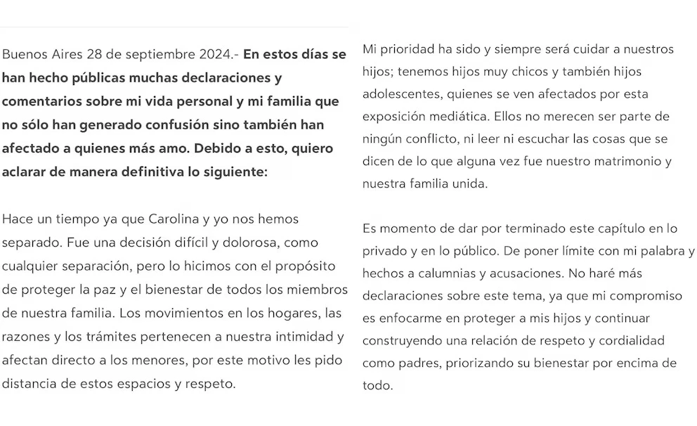 Hasta ahí las fechas parecen coincidir. Sin embargo, lo llamativo de todo esto fue el segundo comunicado que hoy mismo publicó Moritán, donde expone lo siguiente: “Quiero aclarar algo definitivo: hace un tiempo, Carolina y yo nos separamos”. Esto hizo especular que el político habría mentido sobre la ruptura, ya que hace apenas nueve días negó la separación en el mencionado programa de eltrece.