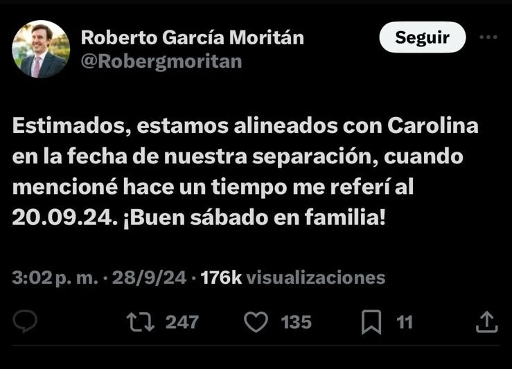 “Estimados, estamos alineados con Carolina en la fecha de nuestra separación, cuando mencioné hace un tiempo me referí al 20.09.24. ¡Buen sábado en familia!”, sentenció Moritán. Más allá de esta aclaración que buscó hacer, las sospechas siguen girando alrededor de las fechas de la ruptura.