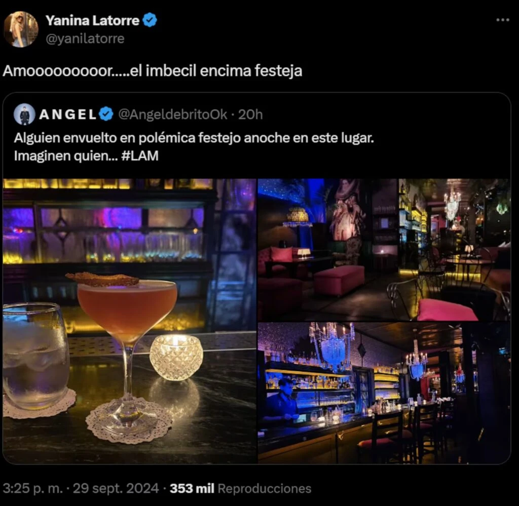 Pero más allá de todas estas especulaciones, quien terminó de confirmar que el ministro porteño estaba de fiesta fue Yanina Latorre, quien no se guardó nada y contraatacó con un picante tuit: “Amor, el imbécil encima festeja”. Si bien la angelita tampoco dio un nombre en concreto, la evidencia volvió a dirigirse hacia Moritán.