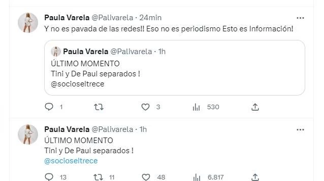 Pero un gran escándalo se desató hace algunas horas cuando Paula Varela decidió romper el silencio y confirmar lo que muchos temían: Tini Stoessel se separó del jugador. La panelista lanzó en sus redes: "Último momento. Tini Stoessel y Rodrigo de Paul separados".