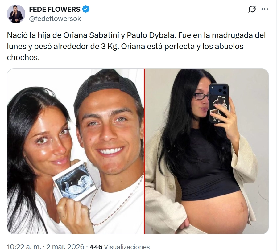 La primicia fue de Fede Flowers, quien compartió la feliz noticia en su cuenta de X hacia las 10. 22 de la mañana en Buenos Aires. "Nació la hija de Oriana Sabatini y Paulo Dybala. Fue en la madrugad del lunes y pesó alrededor de 3 kilos. Oriana está perfecta y los abuelos chochos", señaló el periodista.