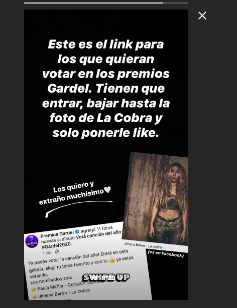 A la espera de que diese un “indicio” sobre su actual vivienda o su estado anímico, por el contrario, en su historia compartió una invitación a votarla para los Premios Gardel, la estatuilla más importante que puede recibir un artista.