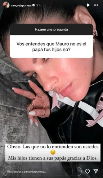 Sin filtros, una usuaria le preguntó: “¿Entendés que Mauro no es el papá de tus hijos?”, a lo que la intérprete respondió sin vueltas y hasta un tanto molesta: “Obvio. Las que no lo entienden son ustedes. Mis hijos tienen a sus papás, gracias a Dios”.