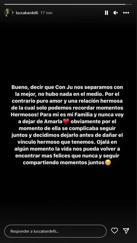 Mientras que Lucca por su parte también decidió romper el silencio con un mensaje mediante su cuenta de Instagram: "Bueno, decir que con Ju nos separamos con la mejor, no hubo nada en el medio. Por el contrario, puro amor y una relación hermosa de la cual solo podemos recordar momentos hermosos”.