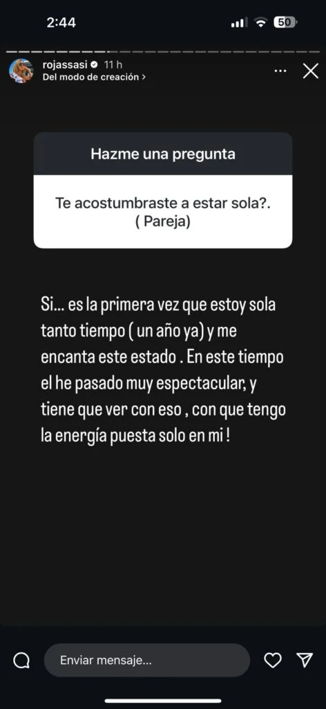 A lo que Rojas contestó: “Si, nunca es fácil, pero te juro que sin darte cuenta, un día todo se acomoda”. Del mismo modo, la ex de Luciano Castro eligió: “¿Te acostumbraste a estar sola? ( Pareja)”. Por su parte, la conductora se sinceró: “Si... es la primera vez que estoy sola tanto tiempo (un año ya) y me encanta este estado”.