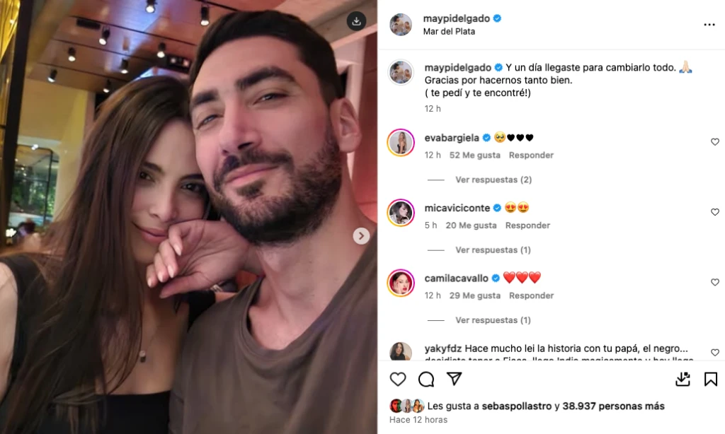 Y fue en las últimas horas que Delgado decidió blanquear la relación con un compilado de bella imágenes, en donde se la ve compartiendo con su enamorado. Y se observan tiernas imágenes de su novio a puro juego, aventuras y risas con la peque. "Y un día llegaste para cambiarlo todo... Gracias por hacernos tanto bien. Te pedí y te encontré", publicó Maipy, junto al posteo de las postales juntos, en Instagram.