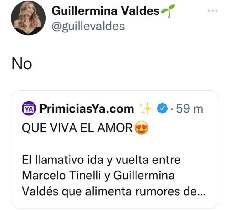 La nota del sitio colega estaba titulada "el llamativo ida y vuelta entre Marcelo Tinelli y Guillermina Valdés que alimenta rumores de reconciliación". Una vez posteada en Twitter, Guillermina la "citó" y decidió hacer su aporte. No reprodujo, como otras veces, una frase de otro autor ni esbozó una sentencia de "sobrecito de azúcar". Para nada. Le alcanzó con algo propio para dejar en claro qué piensa.
