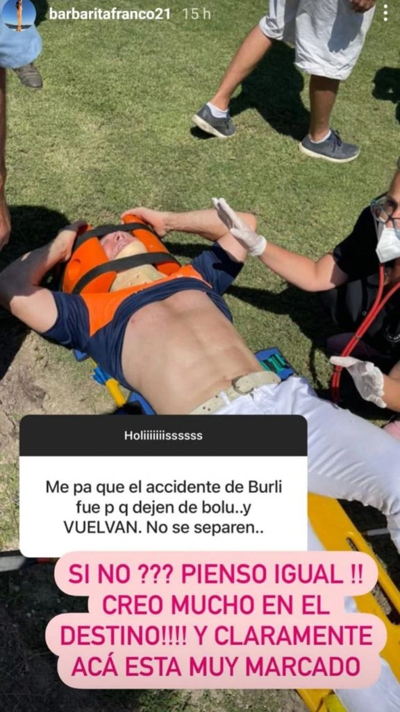 “Me parece que el accidente de Burli fue para que dejen de boludear y vuelvan. No se separen”. Y la modelo se sinceró al responder: “Sí, ¿¿no?? ¡¡Pienso igual!! ¡¡Creo mucho en el destino!! Y claramente acá está muy marcado”, dijo Barby, que hace poco recordó el comienzo de su relación con el letrado, interpretando lo sucedido como una señal.