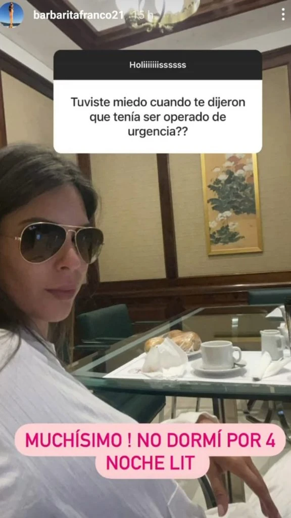 Luego cuando otro follower le consultó si tuvo miedo cuando le dijeron que Fernando debía ser operado de urgencia, Barby compartió se animó a compartir una foto de días en la clínica y reconoció: “¡Muchísimo! No dormí por cuatro noches, literal”, aseguró Franco, que días atrás le puso "los puntos" a Mariana Brey, por llamarlo a su pareja.