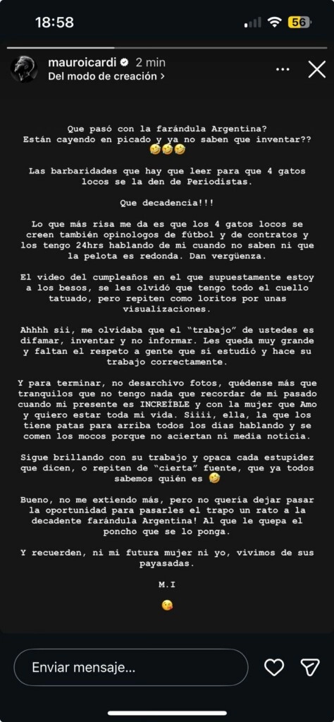 En esa storie que colgó en su Instagram, el ex esposo de Wanda Nara disparó contra el periodismo: “Las barbaridades que hay que leer para que cuatro gatos locos se la den de periodistas. ¡Que decadencia! Lo que más risa me da es que los cuatro gatos locos se creen también opinólogos de fútbol y de contratos y los tengo 24 horas hablando de mi cuando no saben ni que la pelota es redonda. Dan vergüenza”.