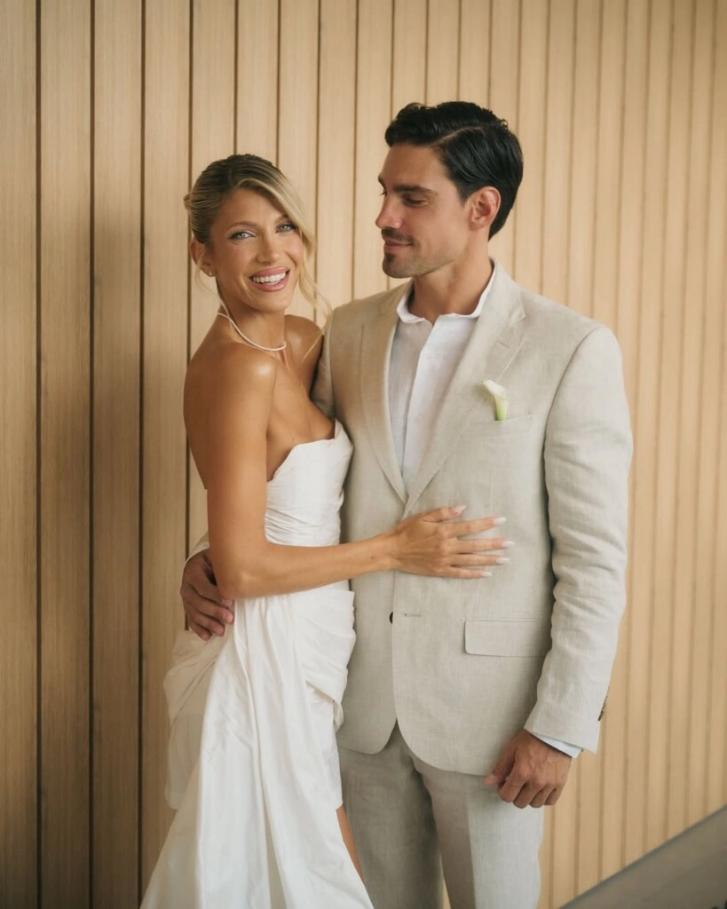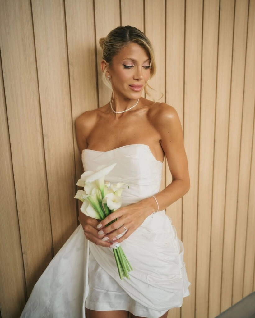 Si hablamos de looks, Cande apostó por un vestido blanco corto, strapless, con una falda amplia y estructurada. Elegante pero sin perder frescura para la ambientación. Completó su outfit con un ramo de flores blancas, sandalias de taco y un peinado recogido. Del otro lado, Nico eligió un traje de corte clásico, con camisa y sin corbata, como parte del clima relajado que tuvo la ceremonia.
