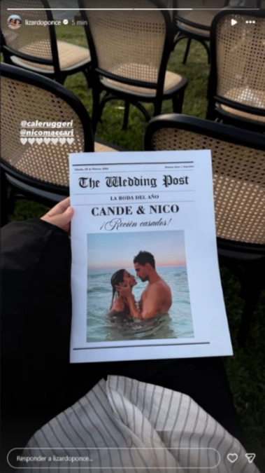 Un detalle interesante fue la entrega de un diario especialmente diseñado para la boda: The Wedding Post, con una foto de la pareja y la frase “La boda del año. Cande & Nico. ¡Recién casados!”. Entre algunos de los famosos invitados que compartieron imágenes en sus redes se encontraban Lizardo Ponce y Sofía Jujuy Jiménez.