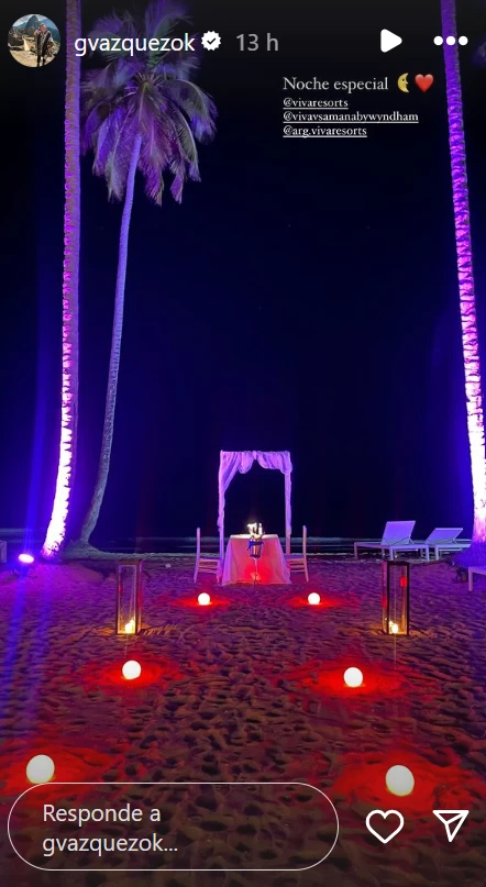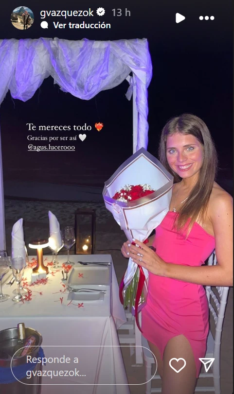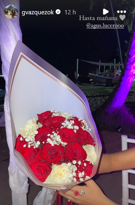 “¿Querés casarte conmigo, Agus? Cumpliendo un sueño en el paraíso”, expresó Gonza en su posteo de Instagram, antes de mostrar la romántica cena con la que agasajó a su prometida a la luz de la luna, a quien le regaló un hermoso ramo de rosas rojas. ¡Un romántico!