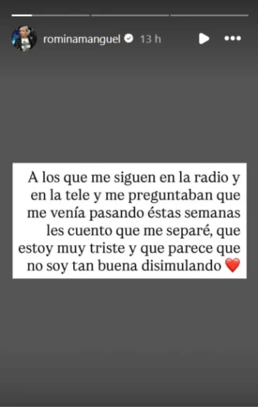 “A los que me siguen en la radio y en la tele y me preguntan que me venía pasando estas semanas, les cuento que me separé. Estoy muy triste y me parece que no soy tan buena disimulando”, escribió Romina en una historia de Instagram que rápidamente despertó la reacción de sus seguidores.