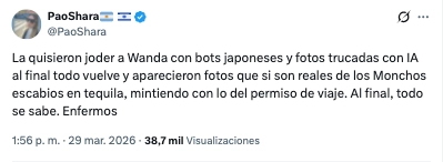 La usuaria @PaoShara utilizó su perfil de X para contar una insólita situación que vivieron Mauro y la China en el boliche. Según explicó, dentro del establecimiento había una mujer que se acercó al futbolista para pedirle una foto. Pero ese simple hecho desató un ataque de furia de la actriz, que sumergida en los efectos del alcohol y los celos, casi se va a las manos con la joven.