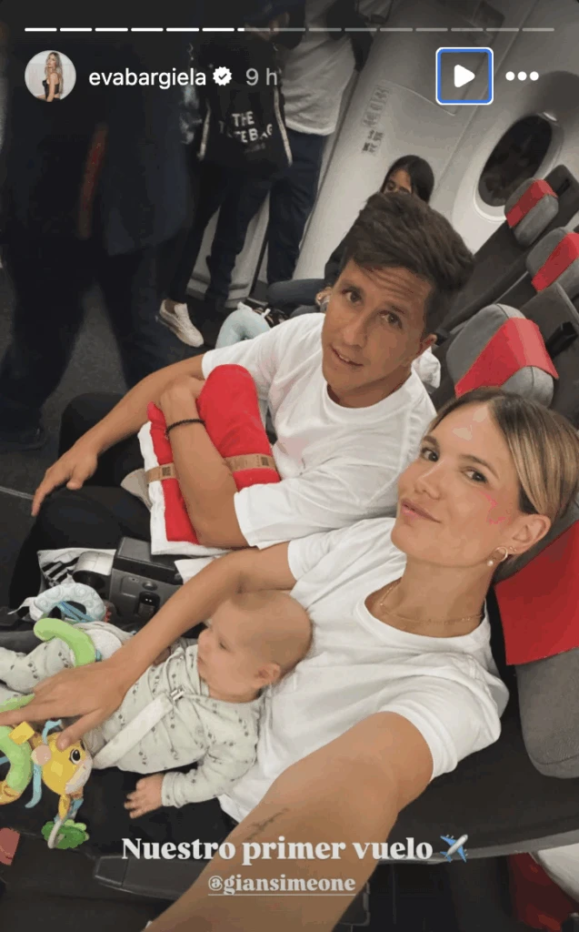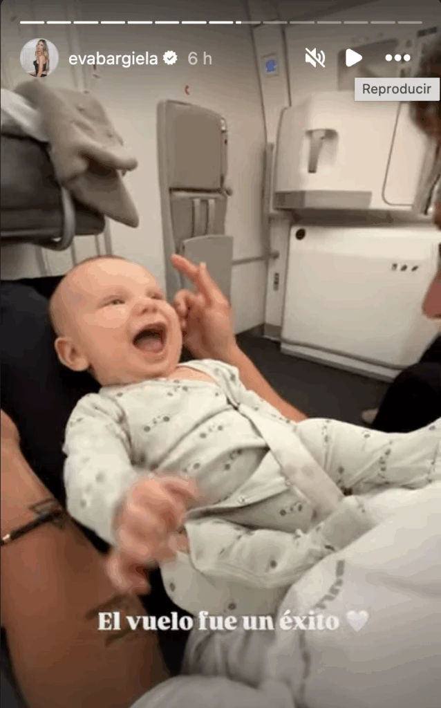 Uno de los momentos más esperados era el vuelo, y la pareja celebró con alivio haber superado esa primera gran prueba. En las imágenes compartidas, se ve al bebé tranquilo y sonriente en brazos de sus padres, mientras Eva resumió la experiencia con una frase contundente: “El vuelo fue un éxito”.