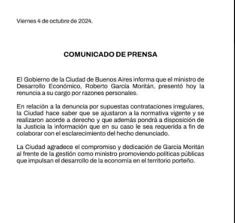 Luego de varias horas de cónclave, la ciudad acaba de emitir un comunicado y confirmó la renuncia de Roberto. “El Gobierno de la Ciudad informa que el ministro de Desarrollo Económico, Roberto García Moritán, presentó hoy la renuncia a su cargo por razones personales”, sostiene el mensaje.