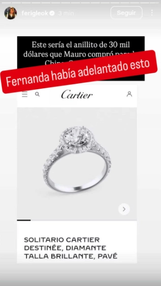 Según explicó Fernanda Iglesias, el valor del anillo elegido por Mauro rondaría los 30.000 dólares, correspondiente a un diamante de entre 1 y 1,2 quilates. Dentro de la misma colección, existen versiones más accesibles que parten desde los 7.000 o 10.000 dólares, pero también piezas que superan ampliamente los 50.000 e incluso los 100.000.