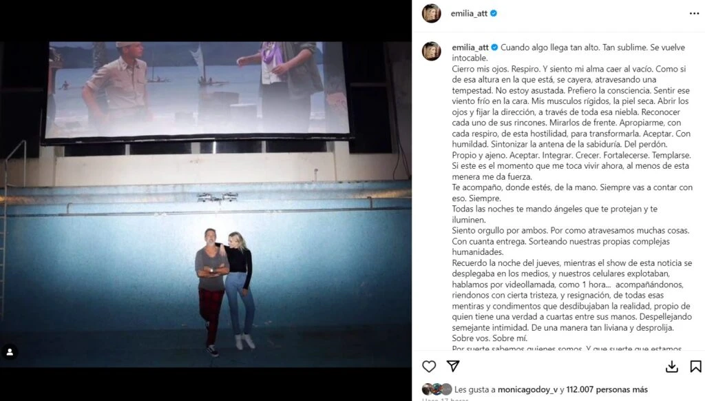 "Ante los dichos de público conocimiento respecto a nuestra relación de pareja queremos comunicar con un profundo dolor que estamos atravesando una separación de común acuerdo... No hay terceras persas involucradas así que agradecemos no citar nombres que nada tienen que ver con los motivos de esta situación y que pueden perjudicar tanto sus vidas personales como las nuestras”, expresó Emilia.