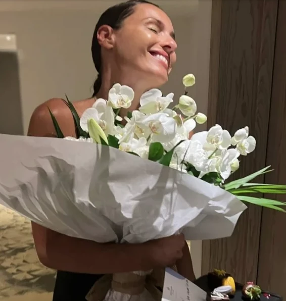 A su exclusiva habitación de la cadena de hoteles Palladium, Pampita recibió un imponente ramo de flores blancas y una tabla con dulces en base a frutas que Roberto pidió acompañar con una tarjeta con dedicatoria.