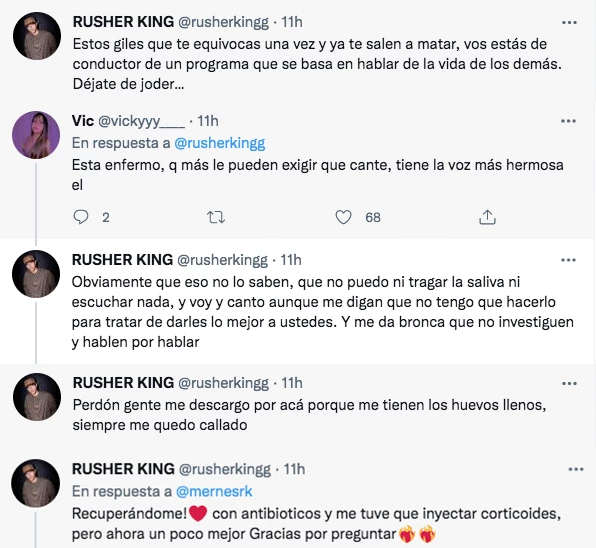Poco después, una seguidora contó que fue a cantar enfermo, algo que fue refrendado por el propio Rusher: "Obviamente que eso no lo saben, que no puedo ni tragar la saliva ni escuchar nada, y voy y canto aunque me digan que no tengo que hacerlo para tratar de darles lo mejor a ustedes. Y me da bronca que no investiguen y hablen por hablar".