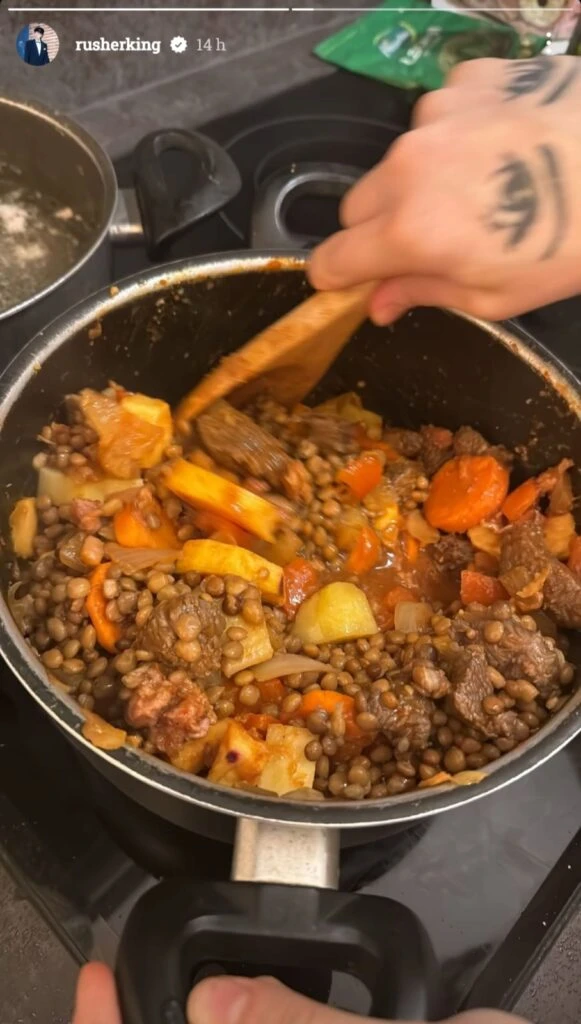 En una de sus historias de Instagram, Rusher subió una foto de una gran olla y las manos de Ángela quien deleitó a su novio con un guiso de lentejas, carne y un mix de verduras para pasar los días fríos en Buenos Aires.
