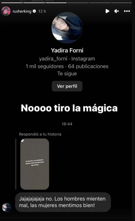 Es que, segundos después de subir esa foto, el santiagueño se corrigió y publicó una aclaración: “Es broma… Los hombres somos más mentirosos… Ley de vida”. Una máxima que generó polémicas y motivó la respuesta de una seguidora llamada Yadira.