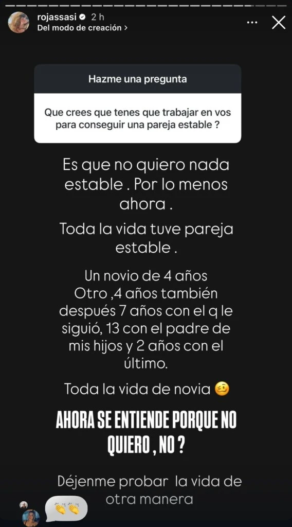 “¿Qué creés que tenés que trabajar en vos para conseguir una pareja estable?”, le escribió un usuario de internet. A lo que Rojas le contestó: “Es que no quiero nada estable. Por lo menos ahora. Toda la vida tuve pareja estable. Un novio de 4 años. Otro, 4 años también, después 7 años con el que le siguió, 13 con el padre de mis hijos y 2 años con el último”.