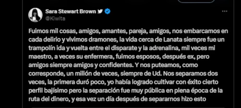"Fuimos esposos, después ex, pero amigos siempre amigos y confidentes. Y nos puteamos, como corresponde, un millón de veces, siempre de Ud. Nos separamos dos veces, la primera duró poco, yo había logrado cultivar con éxito cierto perfil bajísimo pero la separación fue muy pública en plena época de la ruta del dinero, y esa vez un día después de separarnos hizo esto”, decía el posteo que, en su momento, hizo Stewart Brown y que ahora decidió replicar.